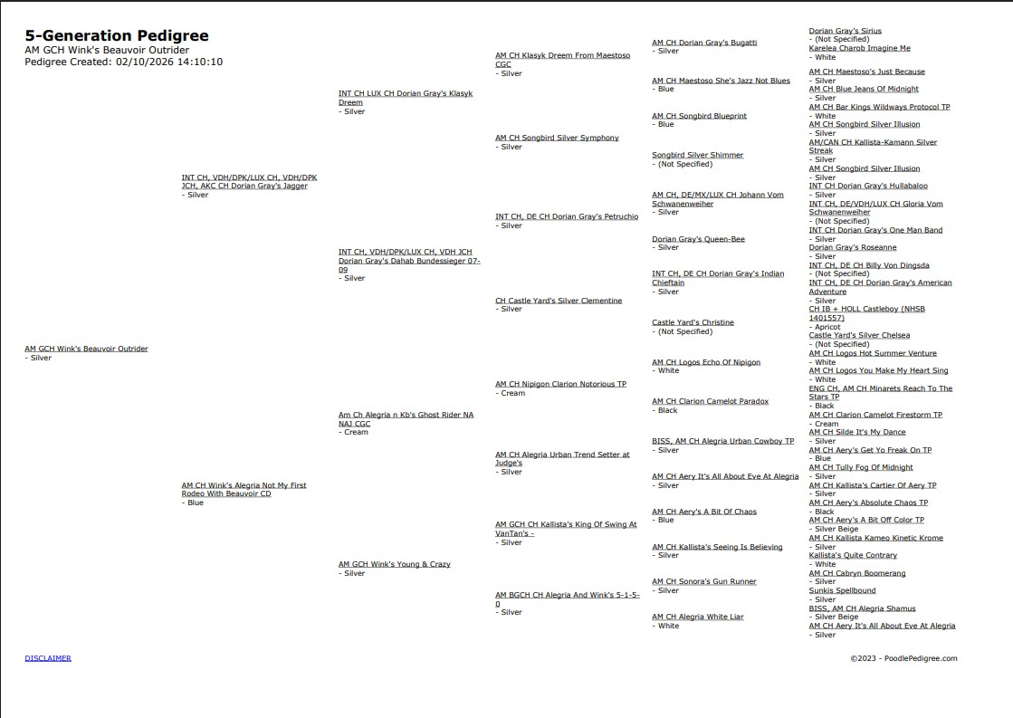 GCH CH Wink’s Beauvoir Outrider “Weston” CH Dorian Gray’s JaggerXCH Wink’s Alegria Not My First Rodeo With Beauvoir, CD WestonPedigree Image of OFA Link